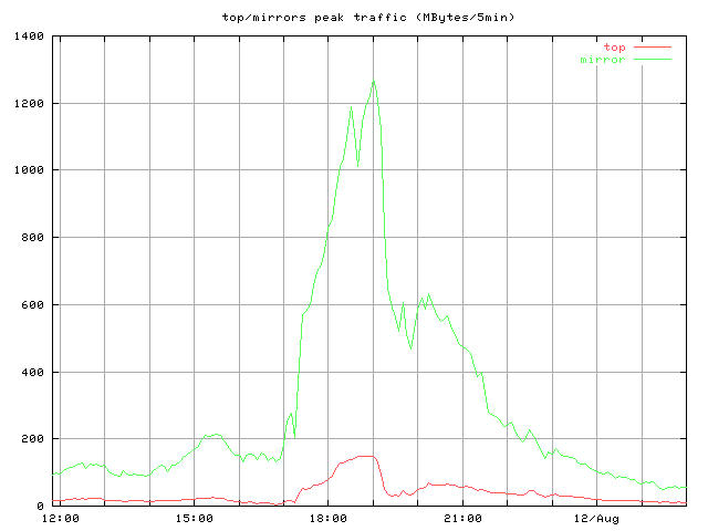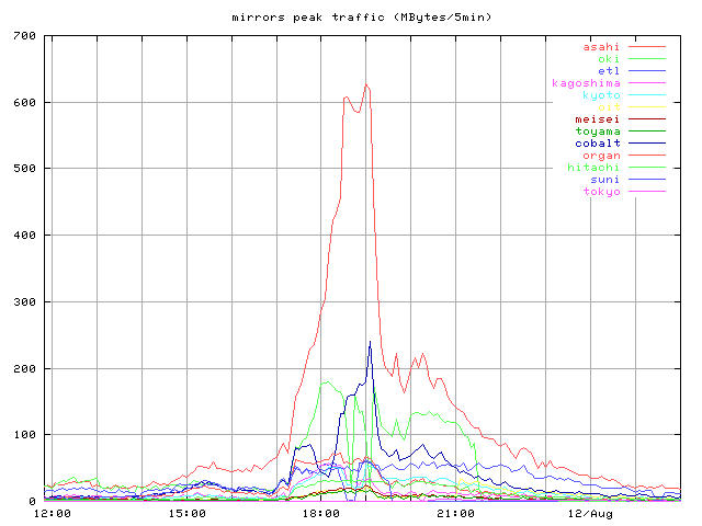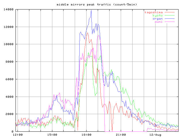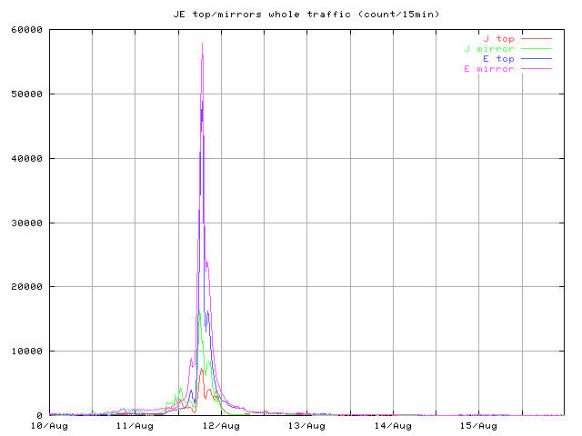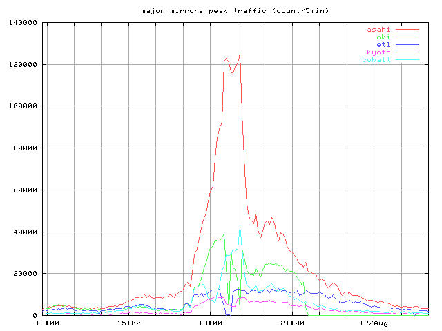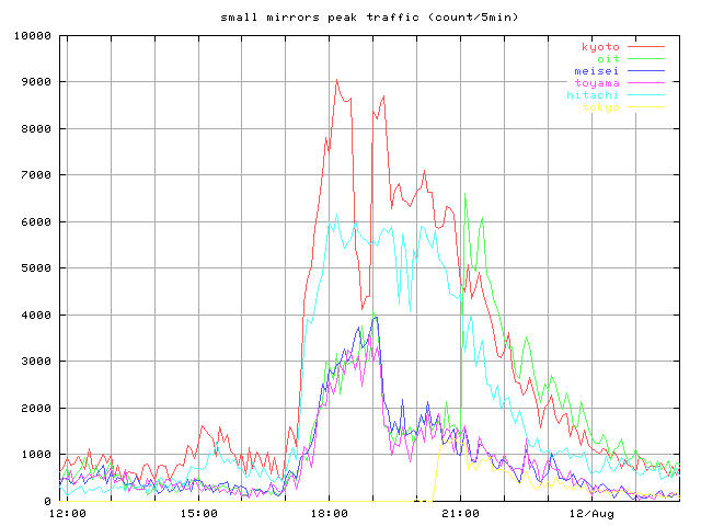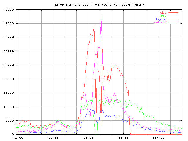whole_?.jpg 8/10-16 まで全体の推移 トップとミラー合計 peak_?.jpg ピーク時間帯のクローズアップ 同じくトップとミラー合計 top_?.jpg トップサーバそれぞれの推移 mirror1_?.jpg 無謀ながら全ミラーの推移を一枚のグラフで mirror2_?.jpg 分担率の高かったミラーを5つ mirror2a_?.jpg 分担率の高かったミラー5つのうちasahi以外の4つ mirror3_?.jpg 中くらいのミラーを3つと比較用にkyotoを mirror4_?.jpg 分担率の低かったミラーを5つと比較用にkyotoをログは時間あたりのヒット数と転送バイト量合計ではかっている。
