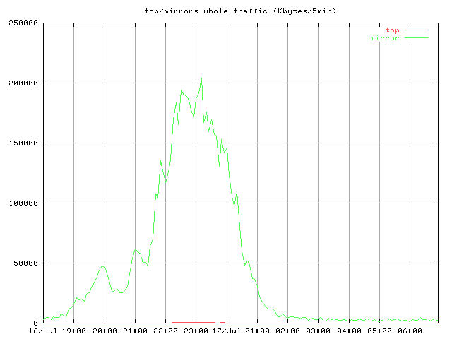 中継時間帯全体の 5 分ごとのバイト転送量。トップサーバと全ミラー。
