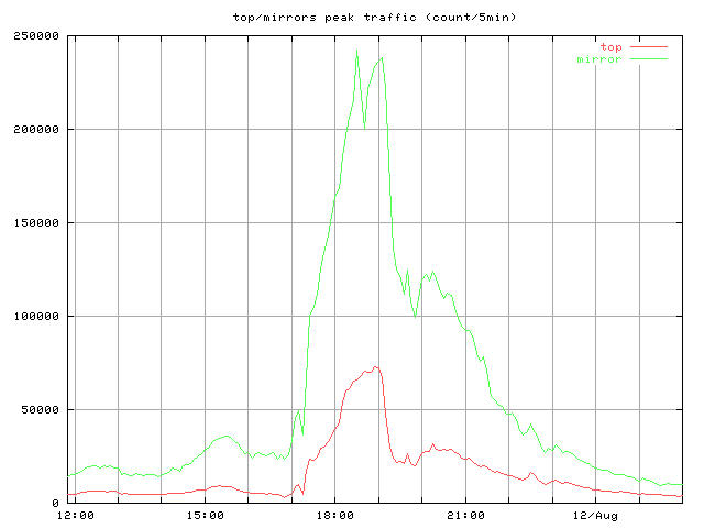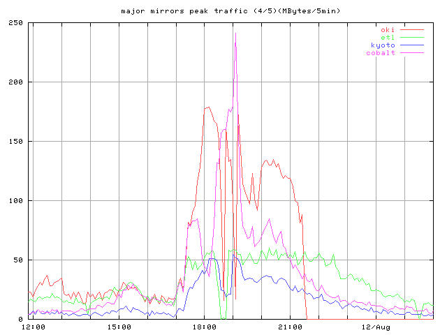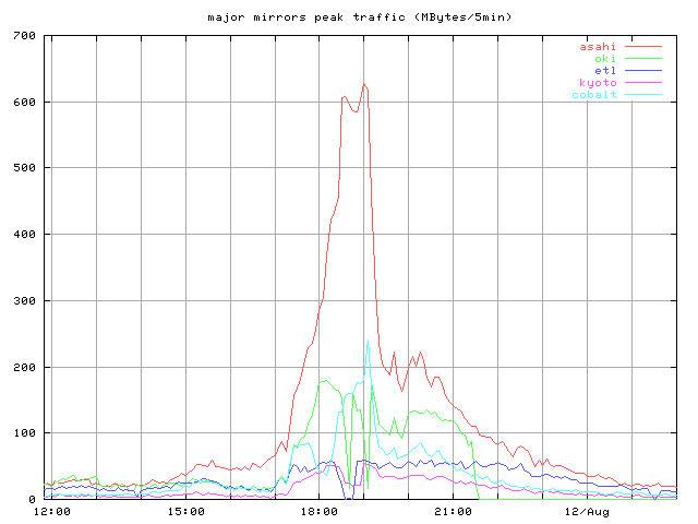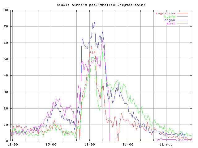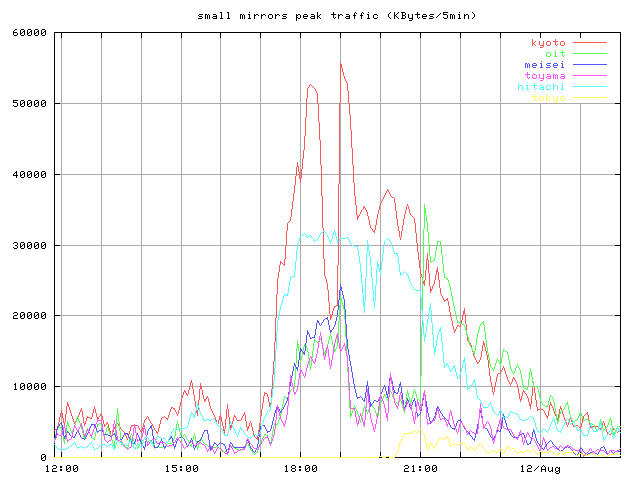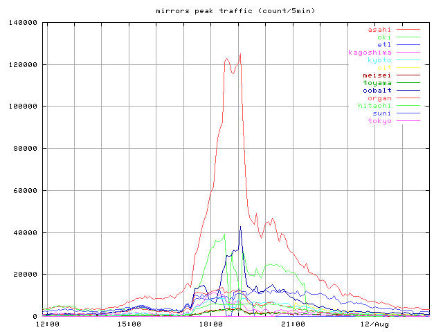 whole_?.jpg 8/10-16 まで全体の推移 トップとミラー合計 peak_?.jpg ピーク時間帯のクローズアップ 同じくトップとミラー合計 top_?.jpg トップサーバそれぞれの推移 mirror1_?.jpg 無謀ながら全ミラーの推移を一枚のグラフで mirror2_?.jpg 分担率の高かったミラーを5つ mirror2a_?.jpg 分担率の高かったミラー5つのうちasahi以外の4つ mirror3_?.jpg 中くらいのミラーを3つと比較用にkyotoを mirror4_?.jpg 分担率の低かったミラーを5つと比較用にkyotoをログは時間あたりのヒット数と転送バイト量合計ではかっている。