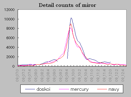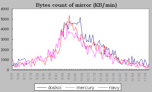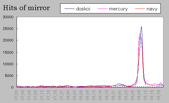 ミラーサイト一つ当たり、ピーク時に1時間当たり3万アクセスですから、言うほどミラーは役に立っていなかったように思います。(T_T) 残念。