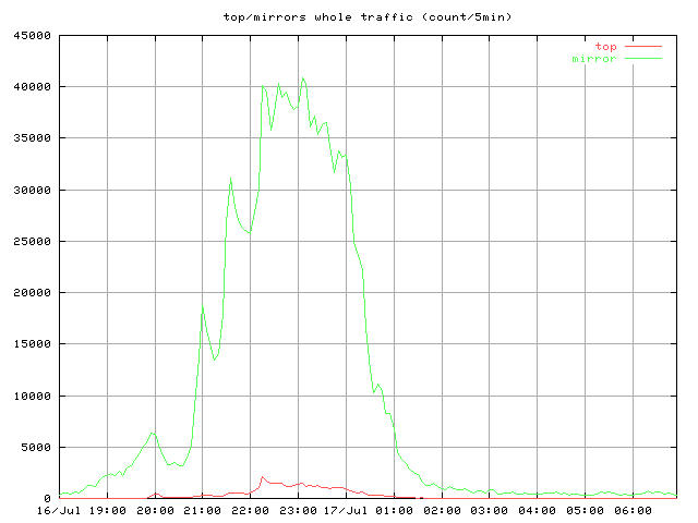 中継時間帯全体の 5 分ごとのヒット数。トップサーバと全ミラー。